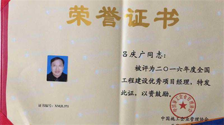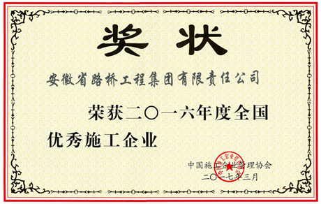 近日,中國施工企業(yè)管理協(xié)會在廈門召開會議,公布了2016年度“全國優(yōu)秀施工企業(yè)”、“全國工程建設(shè)優(yōu)秀項目經(jīng)理” 評選結(jié)果,我公司榮獲2016年度“全國優(yōu)秀施工企業(yè)”,項目經(jīng)理呂慶廣榮獲“全國工程建設(shè)優(yōu)秀項目經(jīng)理”稱號。