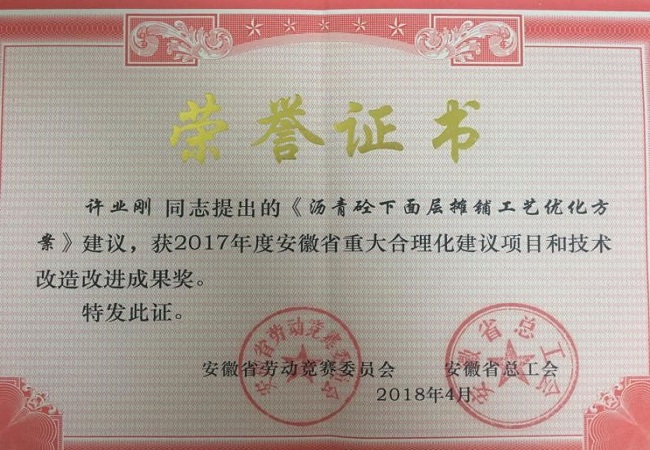 日前安徽省在慶祝“五一”暨“當(dāng)好主人翁、建功新時(shí)代”勞動(dòng)競(jìng)賽推進(jìn)大會(huì)上,對(duì)勞動(dòng)競(jìng)賽先進(jìn)集體和先進(jìn)個(gè)人進(jìn)行了表彰頒獎(jiǎng)。我公司許業(yè)剛同志提出的《瀝青砼下面層攤鋪工藝優(yōu)化方案》榮獲安徽省重大合理化建議項(xiàng)目和技術(shù)改造改進(jìn)成果獎(jiǎng)。