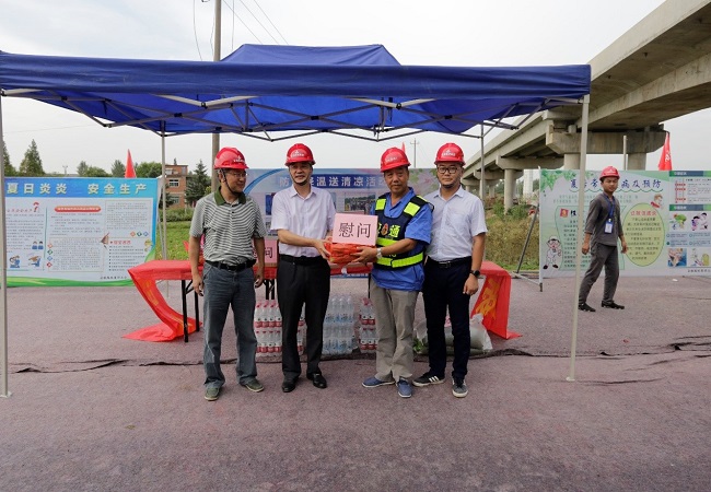戴總一行來(lái)到項(xiàng)目施工現(xiàn)場(chǎng),將藥品、飲料等防暑降溫物品親自送到一線職工手中,詳細(xì)查看了項(xiàng)目部防暑降溫相關(guān)措施,要求項(xiàng)目部合理安排施工,保證高溫作業(yè)下一線職工的安全和健康。