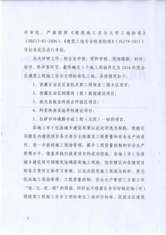 經(jīng)過一系列有力措施,施工一年多來,該項目未發(fā)生一起安全事故。安全文明施工達到標準化和常態(tài)化,施工現(xiàn)場文明整潔,營造了安全和諧的施工氛圍,受到各方的肯定。經(jīng)西藏自治區(qū)住房和城鄉(xiāng)建設廳資料審核、現(xiàn)場勘查、初評、綜評、終評等環(huán)節(jié)考評,最終從百家申報單位中脫穎而出,獲評西藏自治區(qū)“建設工程施工安全文明標準化工地”,為公司在西藏自治區(qū)營造了良好的社會形象。