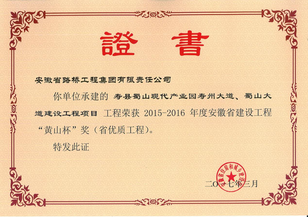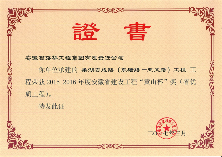 近日,安徽省建設廳發(fā)文公布了2015-2016年安徽省建設工程“黃山杯”獲獎項目名單,我公司承建的績溪至黃山(歙縣呈村降)高速公路、巢湖安成路(東塘路-亞父路)工程、壽縣蜀山現代產業(yè)園壽州大道、蜀山大道建設工程3個項目榮獲該殊榮。