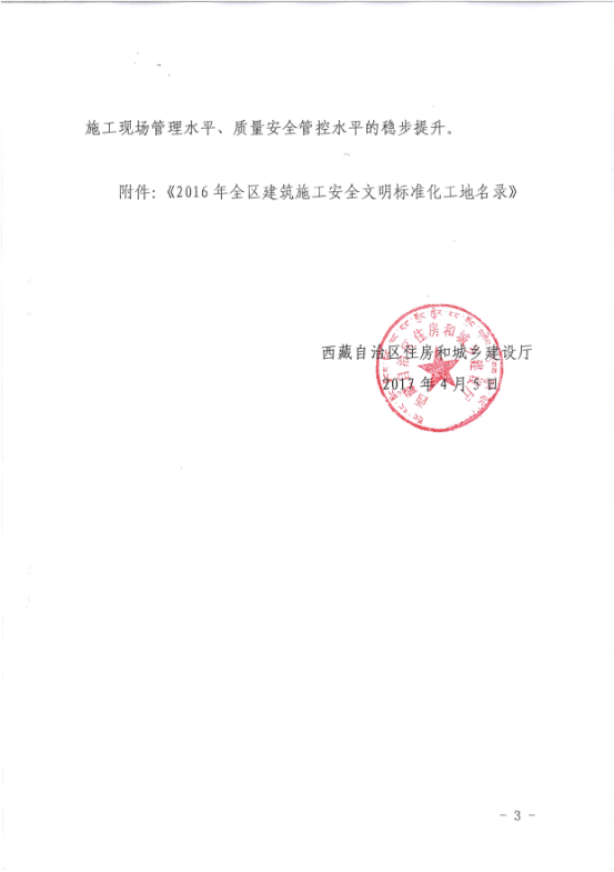 經(jīng)過一系列有力措施,施工一年多來,該項目未發(fā)生一起安全事故。安全文明施工達到標準化和常態(tài)化,施工現(xiàn)場文明整潔,營造了安全和諧的施工氛圍,受到各方的肯定。經(jīng)西藏自治區(qū)住房和城鄉(xiāng)建設廳資料審核、現(xiàn)場勘查、初評、綜評、終評等環(huán)節(jié)考評,最終從百家申報單位中脫穎而出,獲評西藏自治區(qū)“建設工程施工安全文明標準化工地”,為公司在西藏自治區(qū)營造了良好的社會形象。
