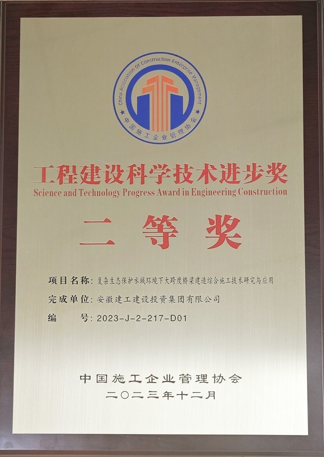 近日,2023年度中國工程建設(shè)科學(xué)技術(shù)進(jìn)步獎(jiǎng)?lì)C獎(jiǎng)大會在北京召開,由安徽建工建設(shè)投資集團(tuán)牽頭的“復(fù)雜生態(tài)保護(hù)水域環(huán)境下大跨度橋梁建造綜合施工技術(shù)研究與應(yīng)用”項(xiàng)目榮獲2023年度工程建設(shè)科學(xué)技術(shù)進(jìn)步獎(jiǎng)二等獎(jiǎng)。