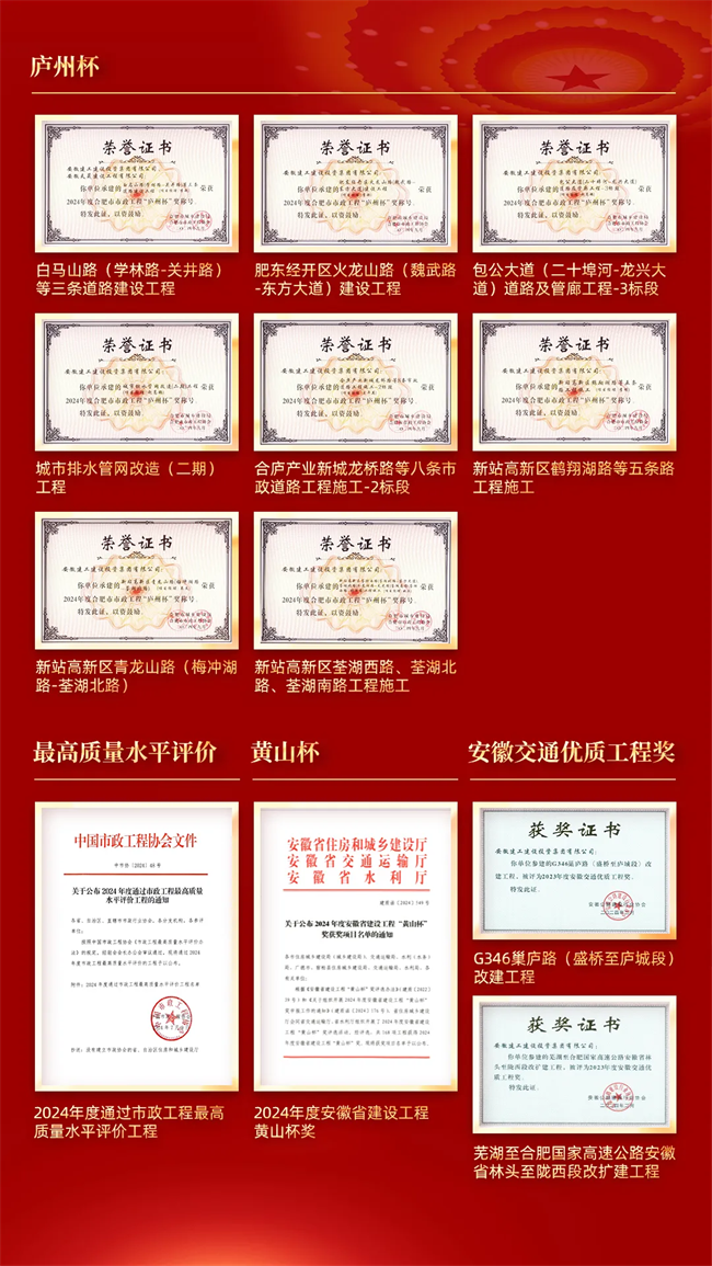 2024年2月,承建的G346巢廬路(盛橋至廬城段)改建工程等2個項目獲得安徽交通優(yōu)質(zhì)工程獎;