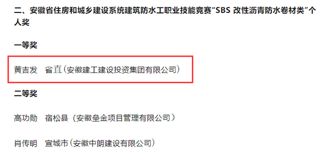 7月19日上午,2024年安徽省住房和城鄉(xiāng)建設(shè)系統(tǒng)防水工職業(yè)技能競(jìng)賽暨第一屆全國住房城鄉(xiāng)建設(shè)行業(yè)職業(yè)技能大賽、全國建筑防水行業(yè)職業(yè)技能競(jìng)賽安徽省選拔賽在全椒順利舉辦。建工建投集團(tuán)員工黃吉發(fā)參加比賽并榮獲“SBS改性瀝青防水卷材類”個(gè)人一等獎(jiǎng),建工建投集團(tuán)也被授予團(tuán)體一等獎(jiǎng)!