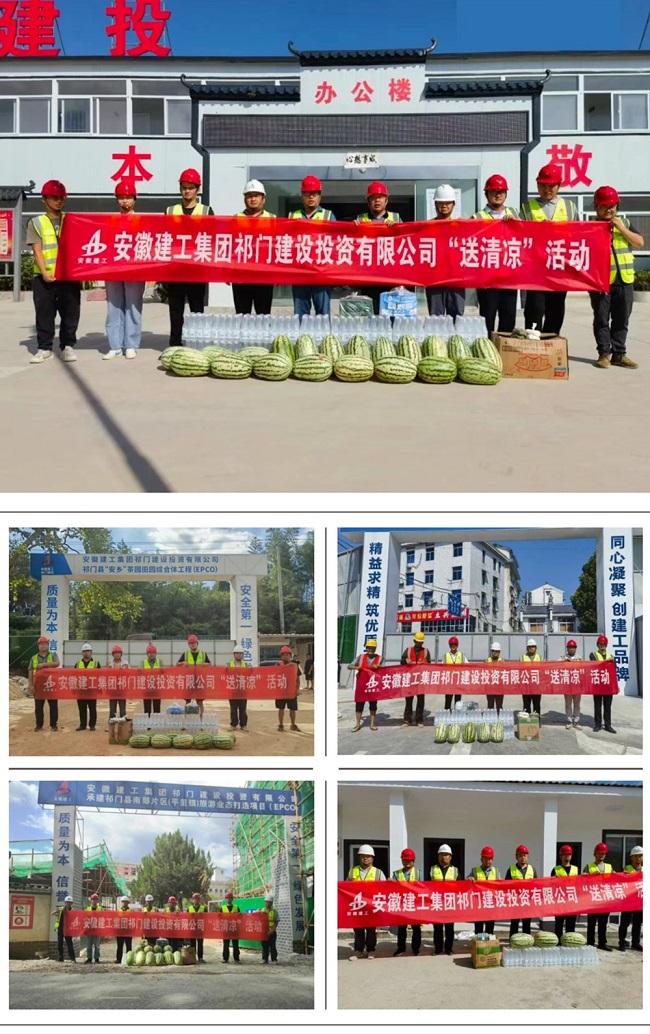 在F012塔坊至平里公路改建工程項目、“安鄉(xiāng)”茶園田園綜合體工程項目、南部片區(qū)(平里鎮(zhèn))旅游業(yè)態(tài)打造項目、祁門經(jīng)濟(jì)開發(fā)區(qū)低碳科創(chuàng)園基礎(chǔ)設(shè)施項目、電商物流產(chǎn)業(yè)園項目、梅城大廈建設(shè)工程項目的施工現(xiàn)場祁門建投領(lǐng)導(dǎo)班子為一線工作人員送去綠豆、人丹、十滴水、西瓜、礦泉水等防暑降溫物品,對高溫下堅守一線的員工表示誠摯的慰問和衷心的感謝,叮囑大家要注意休息,提高自我保護(hù)意識。同時,要求項目管理團(tuán)隊要認(rèn)真落實好防暑降溫各項措施,備足備齊防暑降溫物資,守牢安全生產(chǎn)底線,合理安排工作時間,采取減少高溫時段室外作業(yè)、輪換作業(yè)、減輕勞動強(qiáng)度等措施,把防暑降溫工作落到實處,確保一線員工的身體健康和施工生產(chǎn)安全有序推進(jìn)。
