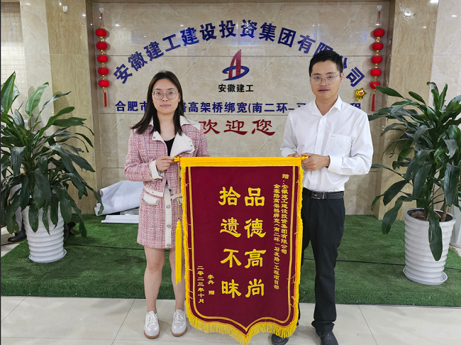 近日,市民李女士將一面印有“拾遺不昧 品德高尚”字樣的錦旗送到建工建投金寨路高架橋綁寬項(xiàng)目部,對(duì)項(xiàng)目管理人員拾遺不昧、妥善保管、積極尋人的行為表示真摯的感謝。