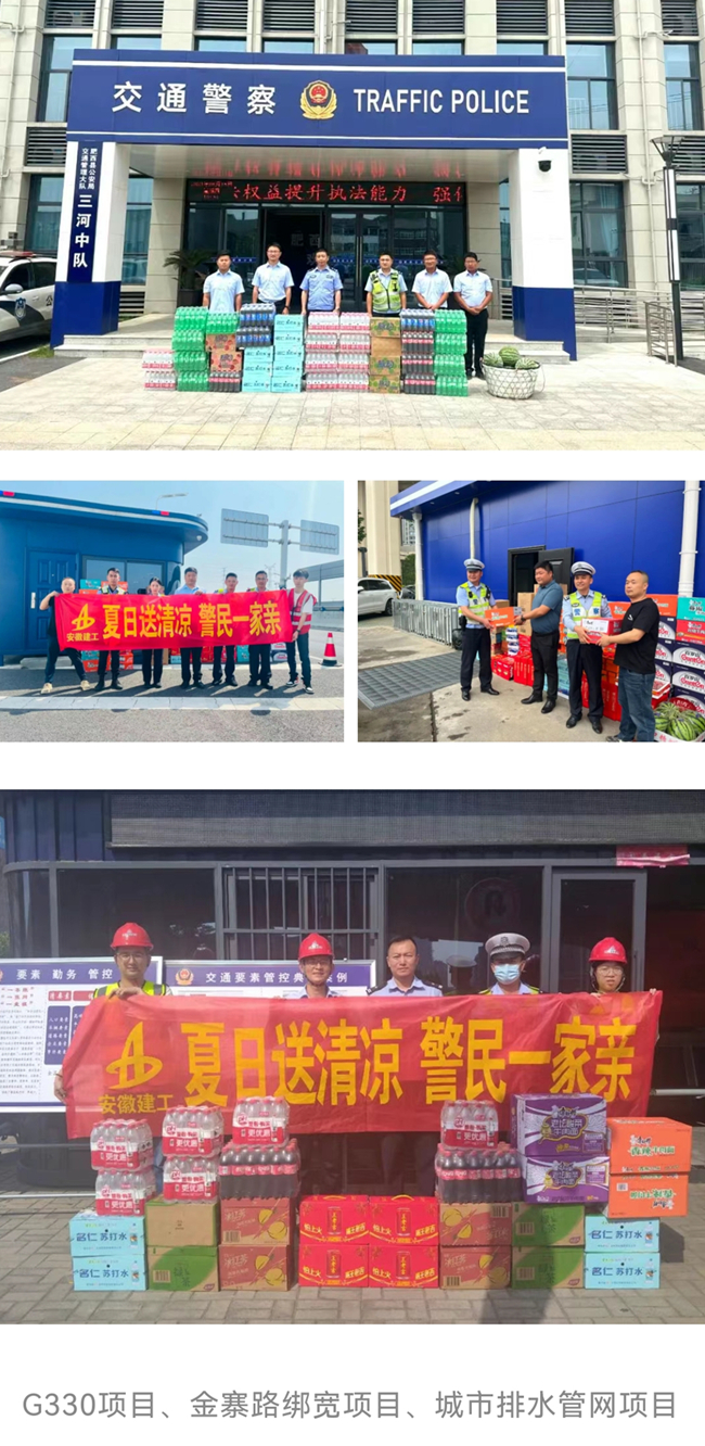 夏日高溫天氣,一線執(zhí)勤交警頂烈日、戰(zhàn)高溫,始終保持高昂的斗志和嚴(yán)整的警姿,為人民群眾的安全出行保駕護(hù)航。安建交建公司金寨路高架綁寬項(xiàng)目、G330合銅公路項(xiàng)目、城市排水管網(wǎng)改造項(xiàng)目近日開展“夏日送清涼,警民一家親”主題活動(dòng),主動(dòng)為一線執(zhí)勤的交警送去礦泉水、飲料、方便面等防暑生活物資,為奮戰(zhàn)在高溫下的“堅(jiān)守者”們送去了絲絲清涼,表達(dá)崇高敬意。