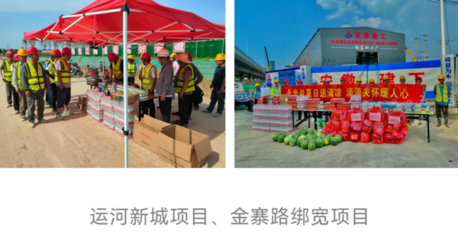 6月10日起,安建交建公司各項(xiàng)目分別組織安全部、綜合部等工作人員為奮斗在一線崗位的作業(yè)人員送去防暑藥品、西瓜、礦泉水、綠豆等防暑降溫物品,并在施工現(xiàn)場設(shè)置休息區(qū)、茶水亭等,為施工人員提供休息和避暑的場所,為奮戰(zhàn)在施工一線的員工送去關(guān)懷和問候。