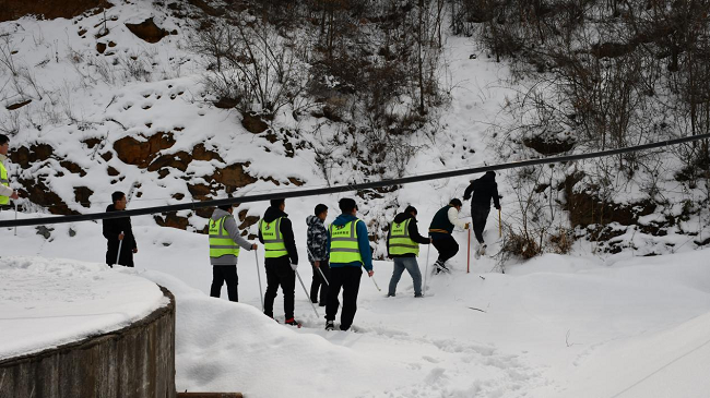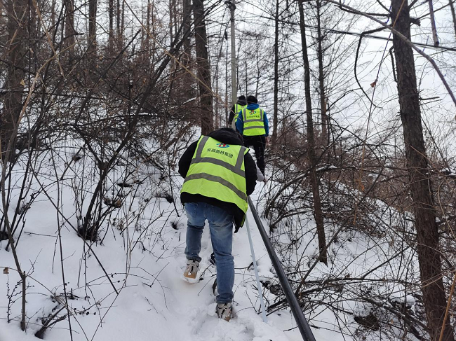 2022年2月10日至21日,在大雪紛飛的天氣里,欒盧項目部先后數(shù)次組織人員,利用中午的時間穿梭在3座山林間,對沿線水管進(jìn)行仔細(xì)排查。山林里沒有路,大家相互攙扶沿著管道用小木棍將水管里的冰一節(jié)一節(jié)敲碎,保持管道里的水正常流動。同時,項目全員歷時10余天,合力解決凍住的水管,更換燒壞的電機(jī)水泵等設(shè)備,順利讓項目部及周邊地區(qū)用上自來水。