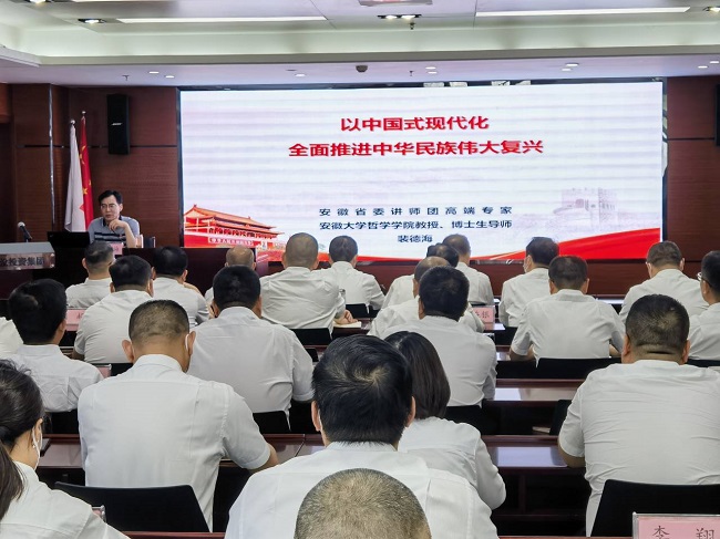 培訓(xùn)邀請(qǐng)到安徽省委宣講團(tuán)高端專家,安徽大學(xué)哲學(xué)學(xué)院教授、博士生導(dǎo)師裴德海進(jìn)行授課。裴教授通過《以中國式現(xiàn)代化全面推進(jìn)中華民族偉大復(fù)興》這一主題,系統(tǒng)闡釋了什么是“中國式現(xiàn)代化”、“中國式現(xiàn)代化”的本質(zhì)要求、“中國式現(xiàn)代化”理論背景和依據(jù)、“中國式現(xiàn)代化”總體戰(zhàn)略安排、實(shí)現(xiàn)“中國式現(xiàn)代化”必須牢牢把握的準(zhǔn)則等內(nèi)容,梳理了中國式現(xiàn)代化的發(fā)展脈絡(luò),幫助大家理解和學(xué)習(xí)了中國式現(xiàn)代化的深刻內(nèi)涵及重大意義。廣大學(xué)員紛紛表示,作為黨員領(lǐng)導(dǎo)干部,要在黨的領(lǐng)導(dǎo)下,始終保持“闖”的精神、“創(chuàng)”的勁頭、“干”的作風(fēng),堅(jiān)定信念,踏實(shí)工作,自覺肩負(fù)起建設(shè)中國特色社會(huì)主義現(xiàn)代化強(qiáng)國的歷史使命,為開創(chuàng)公司高質(zhì)量發(fā)展新局面凝聚磅礴力量。