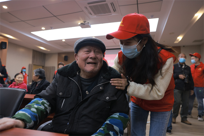 97歲的黃奶奶緊緊拉住志愿者的手,說道:“敬老院的食宿很好,謝謝你們的關(guān)心,歡迎你們經(jīng)常來陪我們聊聊天?!毙腋5男θ菅笠缭诶先藗兊哪樕希F(xiàn)場其樂融融。