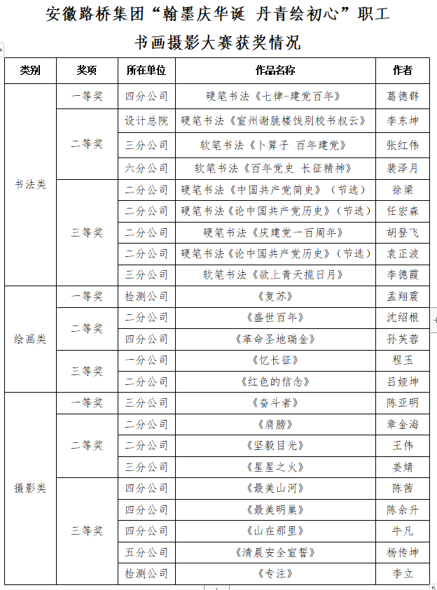 為慶祝中國共產(chǎn)黨成立100周年,安徽路橋集團(tuán)工會舉辦“翰墨慶華誕 丹青繪初心”職工書畫攝影大賽,本次活動得到了公司領(lǐng)導(dǎo)高度重視和公司員工的積極響應(yīng),共收集各類作品64幅,其中書法作品25幅,繪畫作品11幅,攝影作品28幅。這些作品是路橋集團(tuán)職工將筆墨和鏡頭對準(zhǔn)施工生產(chǎn)一線,記錄下路橋人火熱的生活和勞動創(chuàng)造的精彩瞬間,充分展示了路橋集團(tuán)廣大干部職工深厚的文化底蘊(yùn)、飽滿的創(chuàng)作熱情和扎實的藝術(shù)功底。參賽作品風(fēng)格迥異、主題突出、創(chuàng)意鮮明、各具特色,或意境深遠(yuǎn)、氣勢不凡,或氣韻生動、端莊雋永,或粗獷雄逸、盡顯風(fēng)神骨氣,從不同角度洋溢出作者愛祖國、愛生活的情懷,同時也展現(xiàn)了路橋集團(tuán)人昂揚(yáng)向上的時代風(fēng)采。