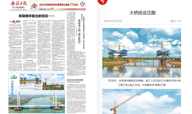 近日,《安徽日報》以圖片新聞形式報道了建工建投集團繁昌區(qū)G236項目二標段黃滸河特大橋建設(shè)進展。