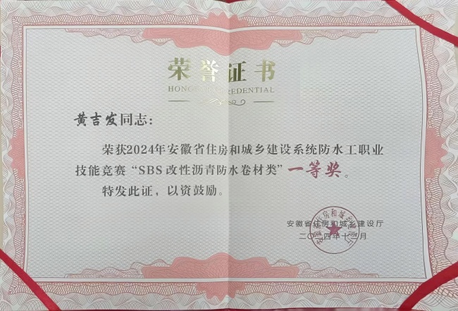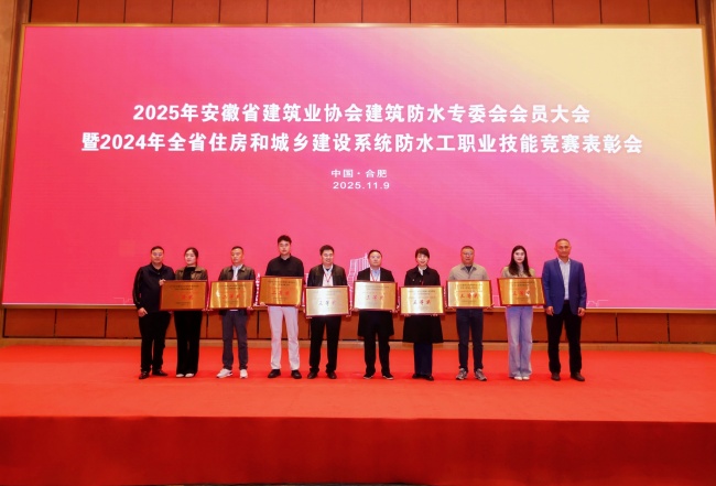 11月9日,2025年安徽省建筑業(yè)協(xié)會建筑防水專業(yè)委員會會員大會暨2024年全省住房和城鄉(xiāng)建設(shè)系統(tǒng)防水工職業(yè)技能競賽表彰會在合肥隆重舉行。會議對在2024年全省防水工職業(yè)技能競賽中表現(xiàn)突出的單位和個人進(jìn)行了表彰。建工建投集團(tuán)榮獲“SBS改性瀝青防水卷材類”團(tuán)體一等獎,員工黃吉發(fā)榮獲個人一等獎,現(xiàn)場登臺領(lǐng)獎受譽(yù)。